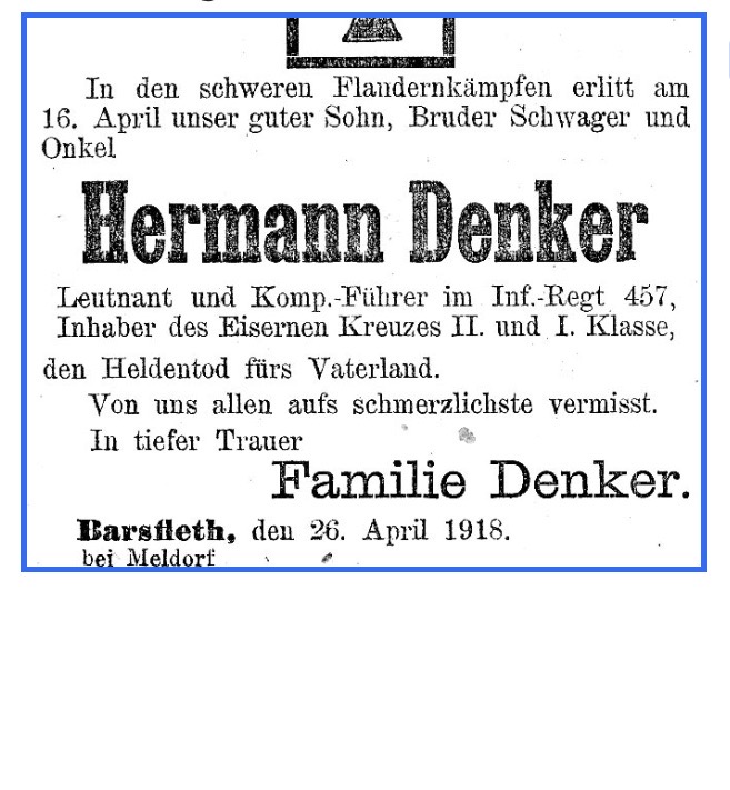 Leutnant u. Komp.‑Führer | DENKER | Hermann | Barsfleth | 16.04.1918 Flandern |