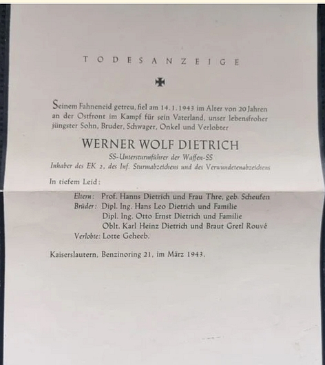 SS-Untersturmführer | DIETRICH | Werner Wolf | 14.01.1943 Ostfront | Waffen-SS |