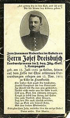 Landwehrmann | DREISBUSCH | Josef | 15.07.1885 Leider | 13.11.1914 Lille, Frankreich | 2.bay.Jäger-Batl., 1.Komp. | seinen Verletzungen erlegen |