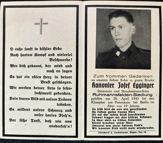 Kanonier | EGGINGER | Josef | 30.04.1926 Ruhmannsfelden | 20.04.1945 Petershain bei Berlin | Kriegsgräberstätte in Neupetershain Nord |