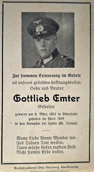 Gefreiter | EMTER | Gottlieb | 08.03.1924 Altenstadt | 04.1945 bei Halbe, Kreis Teltow | Kriegsgräberstätte in Halbe (Deutschland) |