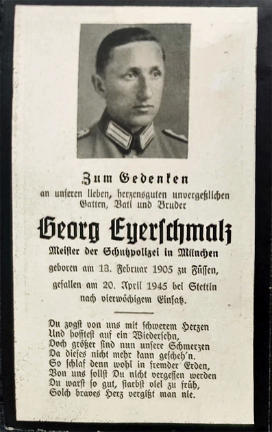 Polizei‑Meister | EYERSCHMALZ | Georg | 13.02.1905 Füssen | 20.04.1945 bei Stettin, bei Schillersdorf, Oderfront | Schutzpolizei | vermutlich als unbekannter Soldat auf die Kriegsgräberstätte Stare Czarnowo überführt |