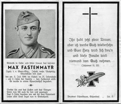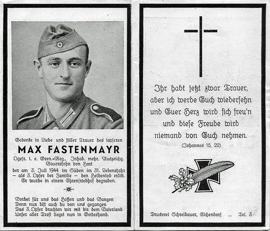 Obergefreiter | FASTENMAYR | Max | 10.08.1913 | 03.07.1944 im Süden | Gren.‑Reg. | im 31. Lebensjahr, Bauerssohn von Hart, Inhaber mehrerer Auszeichnungen, Kriegsgräberstätte in Futa-Pass: Block 30 Grab 137 |