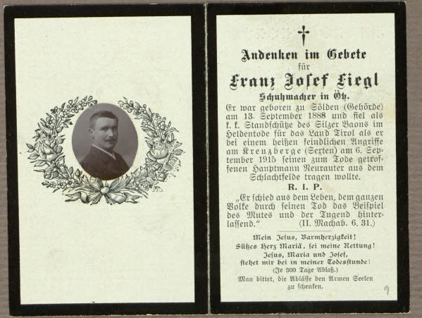 Offiziersdiener | FIEGL | Franz Josef | 1888 | 06.09.1915 | k.k. Standschützenbataillon Silz, 2. Kompanie | Herkunft: Tirol, Bezirk Imst, Sölden |