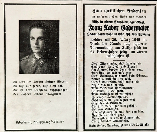 Unteroffizier | GADERMAIER | Franz Xaver | 21.10.1921 Eberschwang | 26.03.1945 Riolo bei Imola, Passarina | Fallschirmjäger-Regiment | gestorben, Kriegsgräberstätte in Futa-Pass |