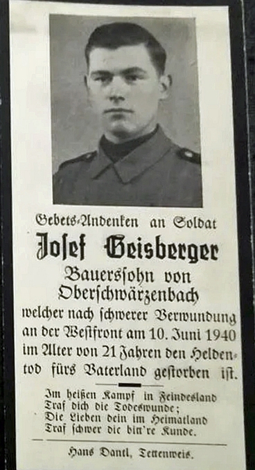 SS-Mann | GEISBERGER | Josef | 31.10.1919 Oberschwärzenbach | 10.06.1940 Mannheim | 1. Komp. SS Regt. "Deutschland" | nach Verwundung an der Westfront gestorben, Kriegsgräberstätte in Mannheim, Hauptfriedhof |