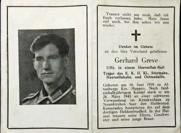 Unteroffizier | GREVE | Gerhard | 10.06.1918 Altenberge, Kreis Meppen | 24.03.1945 Krankenhaus Neukirchen, Saar | Heeresflak‑Batl. | verwundet, gestorben |