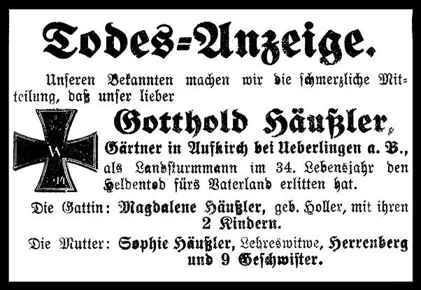 HÄUßLER | Gotthold | 14.09.1883 Unterjettingen, Oberamt Herrenberg | 19.08.1917 bei Haumont vor Verdun |