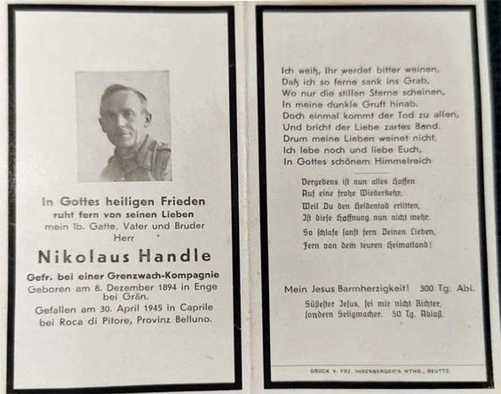 Gefreiter | HANDLE | Nikolaus | 08.12.1894 Enge bei Grän | 30.04.1945 Caprile bei Roca di Pitore, Provinz Belluno | Grenzwach-Kompanie |