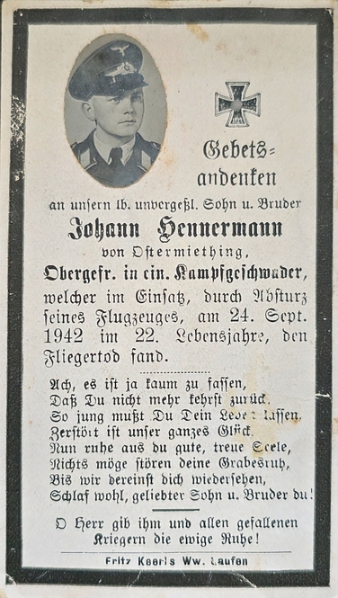 Obergefreiter | HENNERMANN | Johann | 10.07.1921 Hollersbach | 24.09.1942 Leersum, Holland | Kampfgeschwader 6./KG-40 | Bordschütze, Absturz, Kriegsgräberstätte Ysselsteyn, Block CW Reihe 3 Grab 74 |