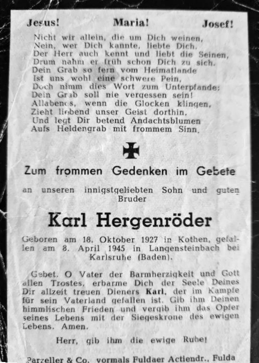 Grenadier | HERGENRÖDER | Karl | 18.10.1927 Kothen | 08.04.1945 Langensteinbach bei Karlsruhe (Baden) |