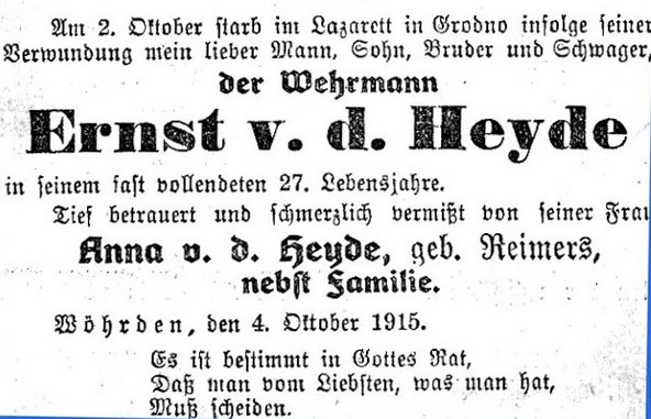 Wehrmann | HEYDE | Ernst von der | 27. Lj. | 02.10.1915 Lazarett Grodno |