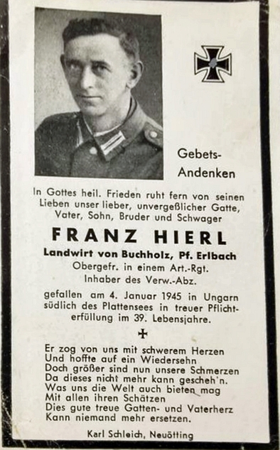 Obergefreiter | HIERL | Franz | 31.07.1906 Schreihof | 04.01.1945 in Ungarn, südlich des Plattensees, 03.01.1945 bei Gattanya |