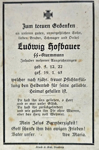 SS-Sturmmann | HOFBAUER | Ludwig | 05.12.1922 Steinberg | 19.01.1945 Ebersberg | Kriegsgräberstätte in Niederbronn les Bains: Block 32 Reihe 1 Grab 24 |
