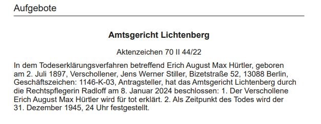 Für tot erklärt durch Beschluss des Amtsgerichts Berlin-Lichtenberg vom 08.01.2024 (Amtsblatt für Berlin, 19.01.2024)