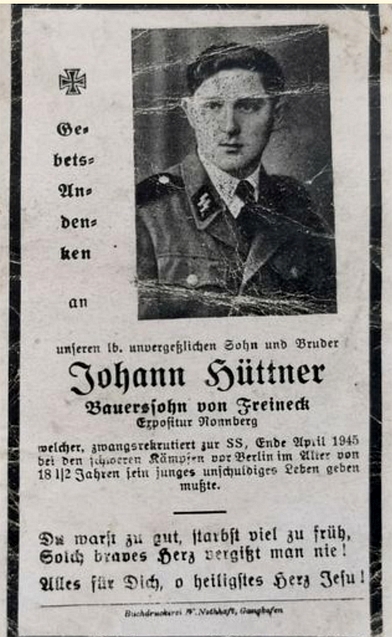 SS-Mann | HÜTTNER | Johann | Freineck | 20.04.1945 bei Berlin | 18 ½ Jahre, zwangsrekrutiert |