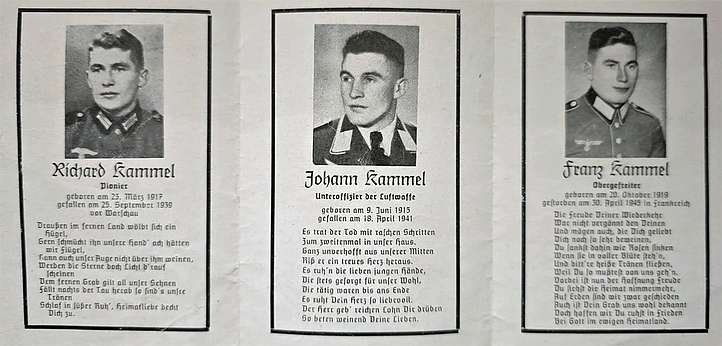 Unteroffizier | KAMMEL | Johann | 09.06.1915 Regensburg | 18.04.1941 Neu‑Rüdnitz | Luftwaffe, Stabskp. Jagdfliegerschule 1, Werneuchen | Bordfunker, Kriegsgräberstätte in Regensburg (Oberer Katholischer Friedhof): Grab 24 W |