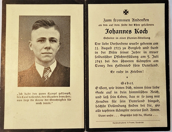 Gefreiter | KOCH | Johannes Mathias | 21.08.1923 Borgloh‑Wellendorf | 05.07.1943 am Donez, Iwanowka H.V.Pl. d.San.Kp. 1/320 | Pionier‑Abtl. | vermutlich als unbekannter Soldat auf die Kriegsgräberstätte Kursk - Besedino überführt |