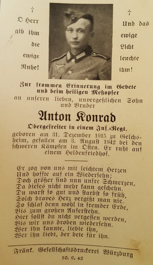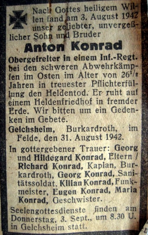 Obergefreiter | KONRAD | Anton | 31.12.1915 Gelchsheim | 03.08.1942 Truchanowo | Inf.Rgt. 252, 5.Kp. | Grab derzeit noch in: Nowaja Derewnja / Olenin – Russland, Bundesarchiv |
