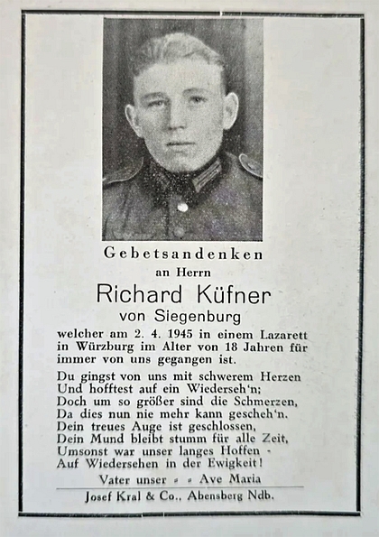 Schütze | KÜFNER | Richard | 29.04.1906 Sellthurn | 02.04.1945 Lazarett in Würzburg | Kriegsgräberstätte in Würzburg, Massengrab am Denkmal |