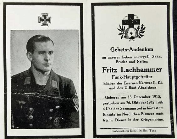 Funk-Hauptgefreiter | LACHHAMMER | Fritz | 13.12.1915 München | 26.10.1942 Nördliches Eismeer, Finnischer Meerbbusen bei Pien-Tytärsaari | 12. U‑Boot Jagd Flot. UJ 1204 | auf Mine gelaufen |