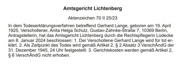 Für tot erklärt durch Beschluss des Amtsgerichts Berlin-Lichtenberg vom 08.01.2024 (Amtsblatt für Berlin, 19.01.2024).