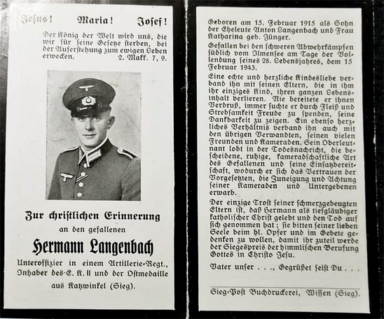 Unteroffizier | LANGENBACH | Hermann | 15.02.1915 Recklinghausen | 15.02.1943 südlich vom Ilmensee, Ssismanowo | 12. Battr. Art. Regt. 290 | aus Katzwinkel (Sieg) |