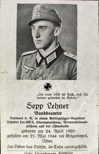 Leutnant d.R. | LEHNER | Sepp | 24.04.1920 Egglham | 21.05.1944 bei Grigoriopol, S.O. Koschnitza | Gebirgsjäger-Regiment | vermutlich als unbekannter Soldat auf die Kriegsgräberstätte Chisinau überführt |