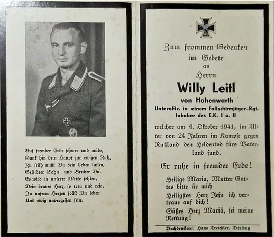 Unteroffizier Oberjäger | LEITL | Willy | 20.06.1917 Ottenhöfen | 04.10.1941 Rußland, Petruschino | 6. Komp. II. Fallschirmjäger-Regiment | LEITL Wilhelm, vermutlich als unbekannter Soldat auf die Kriegsgräberstätte Sologubowka überführt |