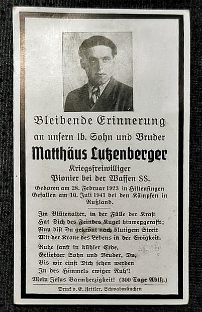 Pionier | LUTZENBERGER | Matthäus | 28.08.1923 Hiltenfingen | 10.07.1941 bei Kurgan, Rußland |