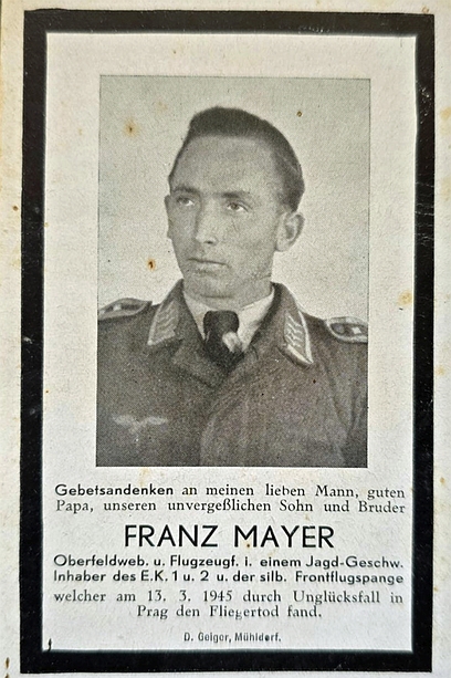 Oberfeldwebel und Flugzeugführer | MAYER | Franz | 30.07.1920 Wald | 13.03.1945 Flughafen Prag‑Rusin | Jagd-Geschwader | vermutlich als unbekannter Soldat auf die Kriegsgräberstätte Cheb überführt |