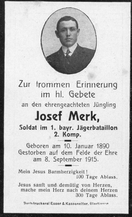 Soldat | MERK | Josef | 10.01.1890 | 08.09.1915 | 1.bayr. Jäberbataillon, 2.Komp. |