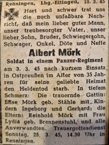 Soldat | MÖRK | Albert | 26.10.1909 | 03.03.1945 bei Görlitz, Ostpreußen | Panzer-Regiment | 35 Jahre |