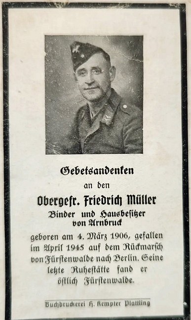 Obergefreiter | MÜLLER | Friedrich | 04.03.1906 | 04.1945 Rückmarsch von Fürstenwalde nach Berlin |