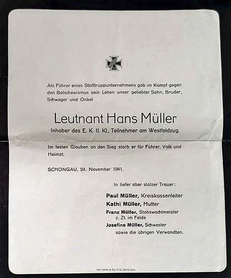 Leutnant | MÜLLER | Hans | 21.05.1914 Hohenpeißenberg | 11.11.1941 Peterhof‑Süd | 9. Komp. Inf. Regt. 316 | Kriegsgräberstätte in Sologubowka: Block 4 Reihe 12 Grab 1121 |