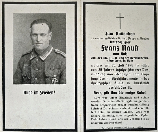 Unteroffizier | NAUß | Franz | 29.01.1910 Holz, Gemeinde Wängle | 26.07.1945 Innsbruck, Klinik |