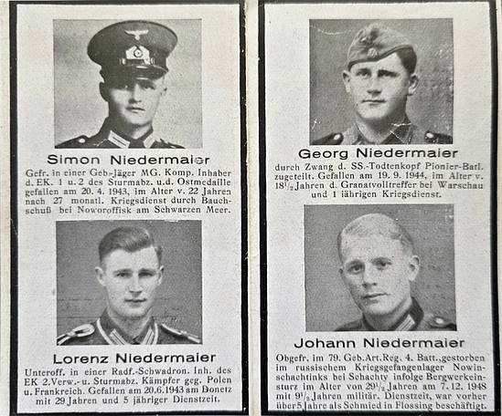 Obergefreiter | NIEDERMAIER | Johann | 17.06.1919 Aschau | 07.12.1948 Kriegsgefangenenlager Nowinschachtinsk bei Schachty | 79.Geb.Art.Rgt., 4.Batt. | |