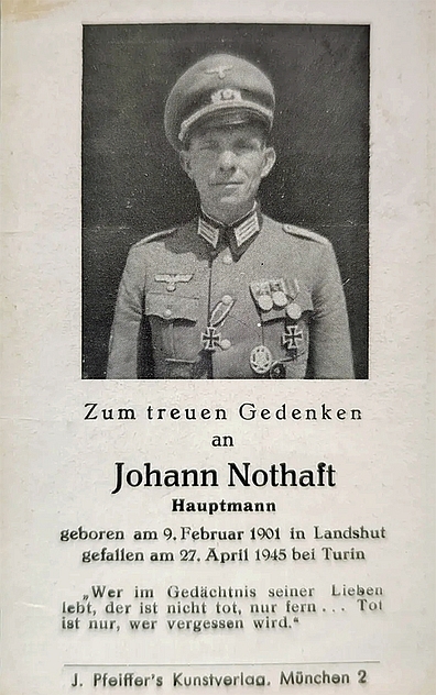 Hauptmann | NOTHAFT | Johann | 09.02.1901 Landshut | 27.04.1945 bei Turin | Kriegsgräberstätte in Cosermano: Block: 6, Grab 1556 |