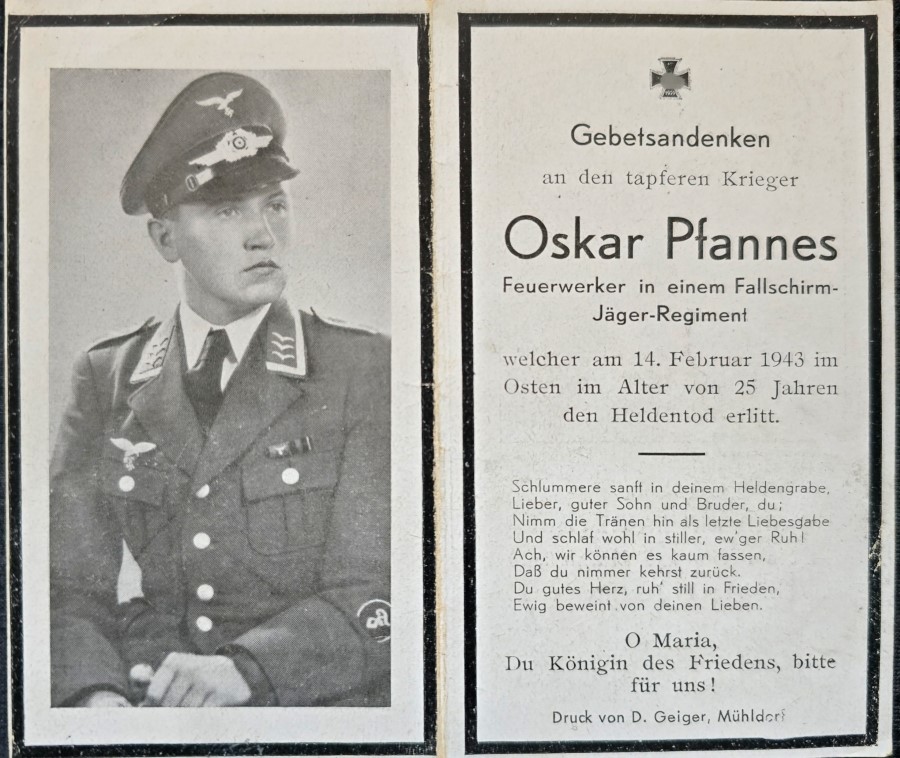 Unteroffizier | PFANNES | Oskar | 27.02.1918 Großlangheim | 14.02.1943 im Osten, Sachody, Russland | 1. Fallschirmjäger Regt. 4, Stab | Feuerwerker |