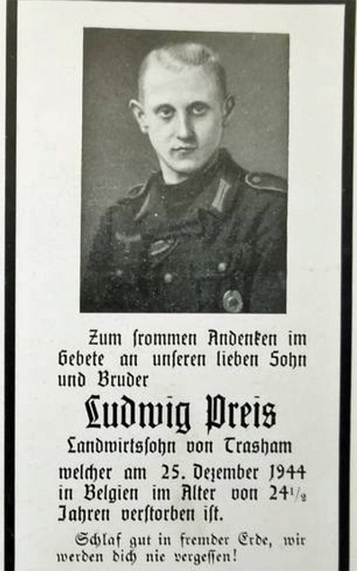 Obergefreiter | PREIS | Ludwig | 04.01.1920 Trasham | 25.12.1944 Belgien | Kriegsgräberstätte in Andilly: Block 13 Reihe 3 Grab 187 |