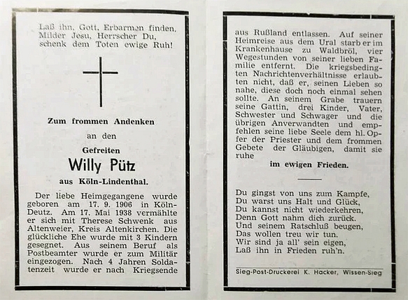 Gefreiter | PÜTZ | Willy | 17.09.1906 Köln-Deutz | Krankenhaus Waldbröl | gestorben auf dem Heimweg aus russischer Gefangenschaft |