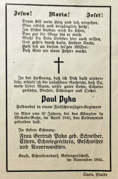 Feldwebel | PYKA | Paul | 25.01.1915 Schreibersdorf | 09.04.1945 Wickende/Ruhr | Kriegsgräberstätte in: Kruft |