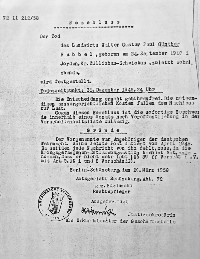 Landwirt in Jordan, Kreis Züllichau-Schwiebus; für tot erklärt durch Beschluss des Amtsgerichts Berlin-Schöneberg vom 20.03.1958;