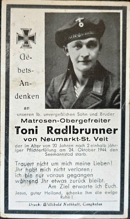 Matrosen-Obergefreiter | RADLBRUNNER | Toni | 30.03.1925 Neumarkt‑St. Veit | 10.10.1944 Hela, Polen |