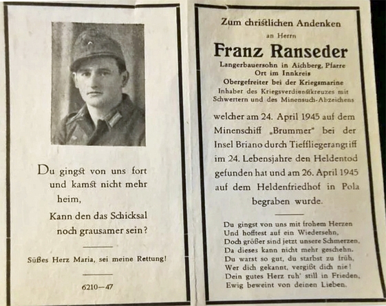 Obergefreiter | RANSEDER | Franz | 24.04.1945 bei der Insel Briano | Minenschiff „Brummer“ | im 24. Lebensjahr, begraben in Pola |