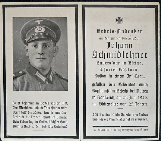 Schütze | SCHMIDLEHNER | Johann | 11.01.1915 Biering | 21.06.1940 Autrey, Frankreich, Westrand des Bois de la Weivre | 10. Komp. Inf.Regt. 423 | Kriegsgräberstätte in Andilly: Block 8 Reihe 3 Grab 177 |