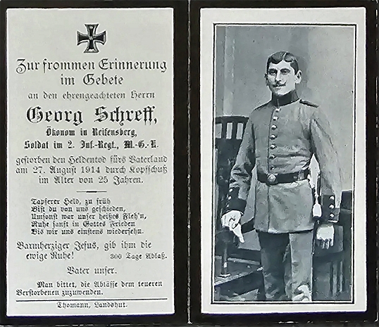 Soldat Infanterist | SCHREFF | Georg | Reifersberg, Niederbayern | 27.08.1914 | 2. Infanterie-Regiment, M.G.K. | 25 Jahre |