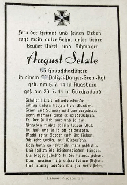 SS-Hauptscharführer | SELZLE | August | 06.07.1917 Augsburg | 23.07.1944, Griechenland Amphissa | SS-Polizei Panzer‑Gren.‑Reg. | Kriegsgräberstätte in Dionyssos-Rapendoza: Gruft 2 Reihe 5 Platte 12 |