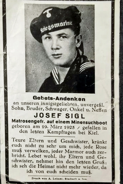 Matrosen-Obergefreiter | SIGL | Josef | 19.03.1925 | 1945 bei Kiel | Minensuchboot |