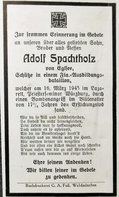 Schütze | SPACHTHOLZ | Adolf | 01.12.1927 Eglsee | 16.03.1945 Lazarett Priesterseminar Würzburg | Flak‑Aubildungs-Batallion | Kriegsgräberstätte in Würzburg, Massengrab am Denkmal |